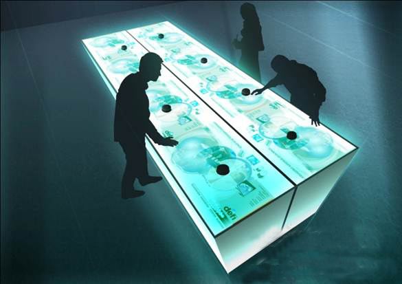 晟跡數(shù)字技術(shù)的觸控展示臺,利用紅外感應(yīng)設(shè)備識別用戶手指動作,通過識別控制系統(tǒng)對高清顯示畫面進行操作。用戶通過雙手進行單擊、雙擊、平移、拉伸、縮放以及旋轉(zhuǎn)等不同手勢觸摸屏幕,對文字、視頻、圖片、動畫等信息進行瀏覽,互動方式非常靈活。